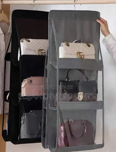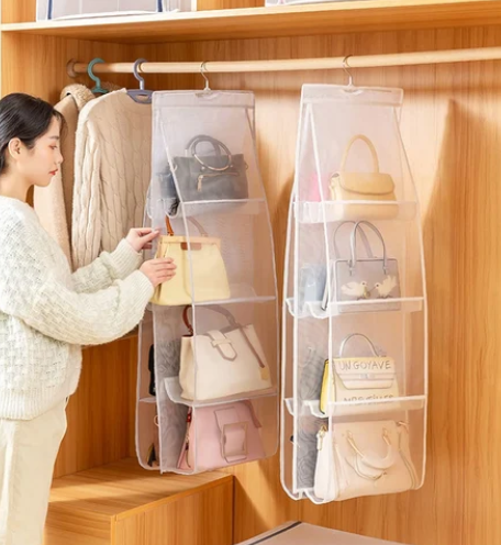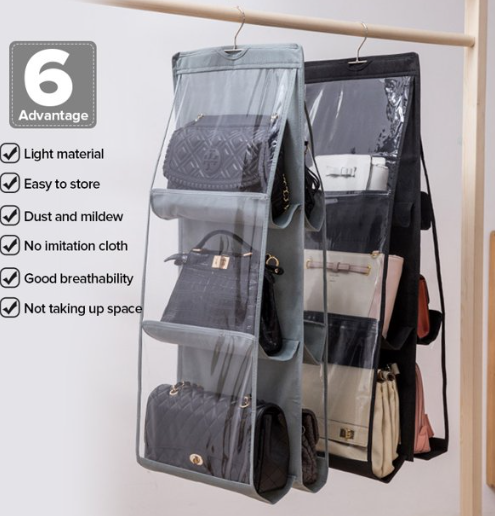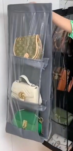- Pockets are generally made with transparent PVC or vinyl windows, allowing you to quickly see and select the hanging handbag organizer, purse, clutch, or accessory you want without having to remove it.