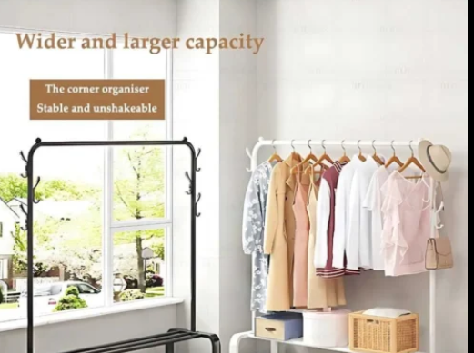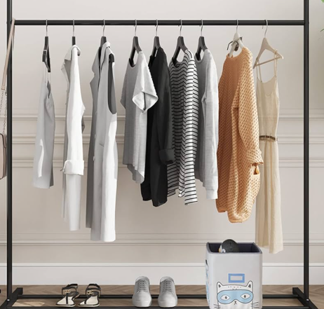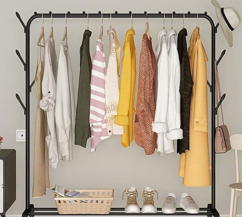 - Ample Storage: Features Portable Hanger Rack Stand single top hanging rod for clothes, multiple side hooks for items like hats and bags, and a bottom shelf for shoes or storage baskets.