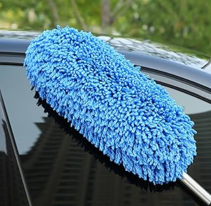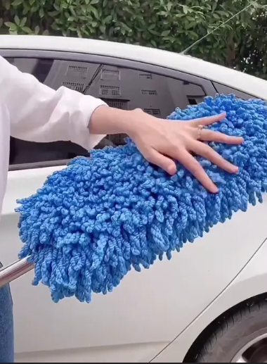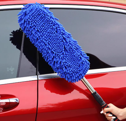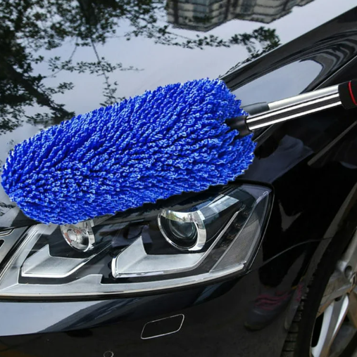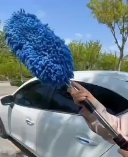 The extendable car duster, telescoping stainless steel handle that easily adjusts to various cleaning needs. The length can be extended from approximately 55 cm to 82 cm (about 21.6 inches to 32.3 inches), allowing users to reach high or difficult-to-access areas without straining or needing a ladder. The handle provides a comfortable grip for effortless maneuvering.