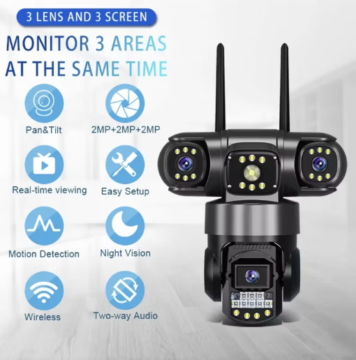Protect what matters most with the Triple-Lens HD Camera, a next-generation monitoring solution built for complete visibility and dependable performance. Featuring three powerful lenses in one compact device, this camera captures wider angles and multiple views at the same time, helping eliminate blind spots and delivering full-area coverage with exceptional clarity.