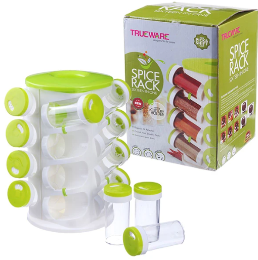 Organize your kitchen like a pro with the Trueware 16-in-1 Revolving Spice Rack with Cutlery Holder, designed to keep your everyday essentials neatly arranged and always within reach. This all-in-one kitchen organizer comes with 16 spice jars and a built-in cutlery holder, making it a perfect solution for clutter-free cooking.