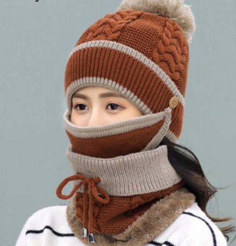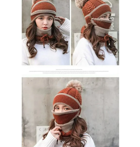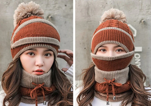 - Knitted beanie cap with a cute pom-pom, a protective face mask, and a neck scarf, providing full coverage against wind and cold.